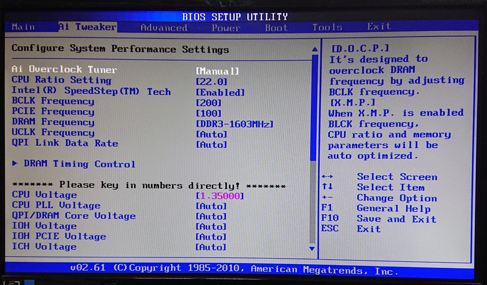FSB 200에 배수는 22, 램 클럭 비율은 1:8을 넣어 램 클럭은 1600MHz, CPU 클럭은 200 X 22로 4.4GHz