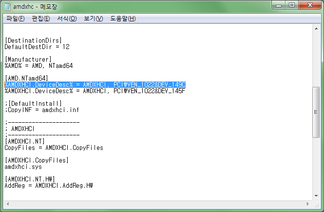 C:\AMD\Chipset_Driver_Installer\AMD_Chipset_Drivers\MSIFiles\program files\AMD\Chipset_IODrivers\USBController Driver\Win7\x64 라는 아주 복잡한 경로를 찾아들어가보면 amdxhc.inf 파일이 있는데 이를 메모장으로 연다