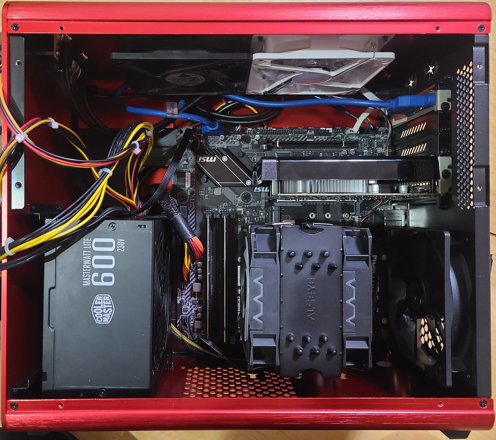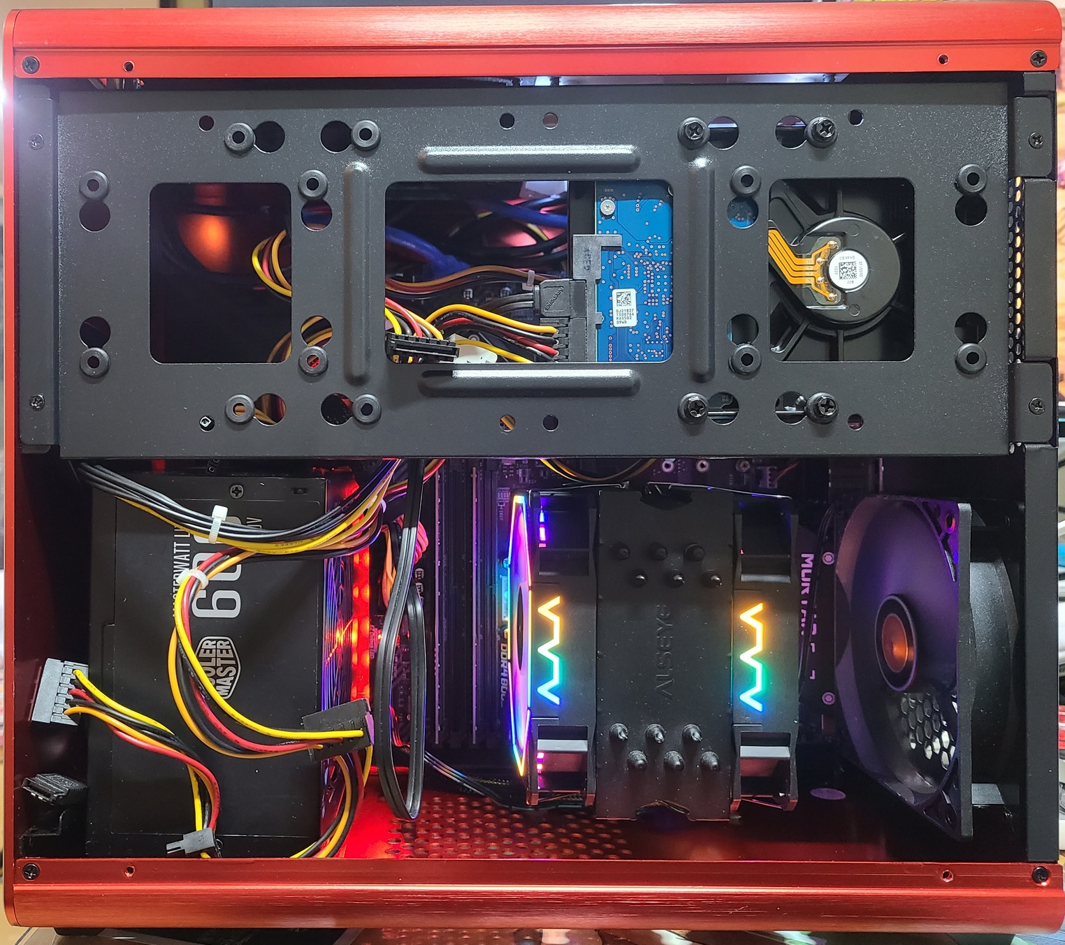 일단 먼지 필터가 달려있는건 상단뿐이기에 상단부로 흡기하라는 의미로 받아들이고 상단 흡기에 후면 배기로 구성했다 - 케이스 하단부에 보이는 타공 부분은 3.5인치 하드나 120mm 팬을 추가 장착 가능하다