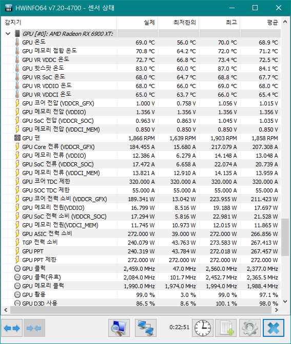 오버클럭은 전압 1.175V / GPU 클럭 2600 ~ 2700 / VRAM 타이밍 빠름 / VRAM 클럭 2150MHz... 정도로 확인해봤는데 별 다른 성능 향상이 없거나 되레 내려간다