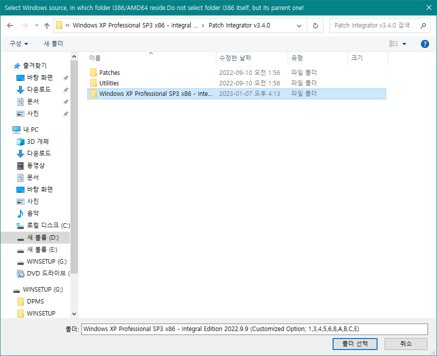 방금전 압축을 풀어둔 폴더(혹은 iso 파일을 마운트한 드라이브)를 '폴더 선택'을 클릭해서 선택한다