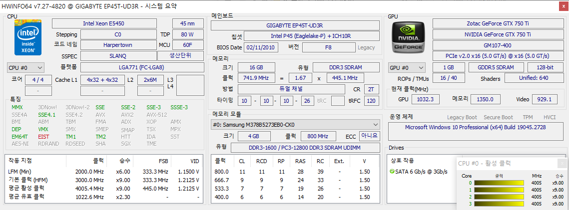 메인보드는 기가바이트의 GA-EP45T-UD3R로 개조 바이오스가 적용되어 소켓 771 개조 제온을 사용할 수 있다
