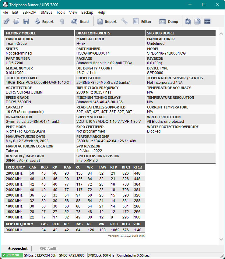 타이푼버너상으로는 파트 넘버 7번째 자리가 ?로 되어 있어 무슨 다이인지를 알 수 없으나, 8~9번째 자리가 GB로 돼있는데 이는 5600MHz에 램타이밍 46-45-45으로, 이런 스펙은 A다이 밖에 없다고 한다