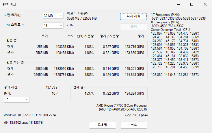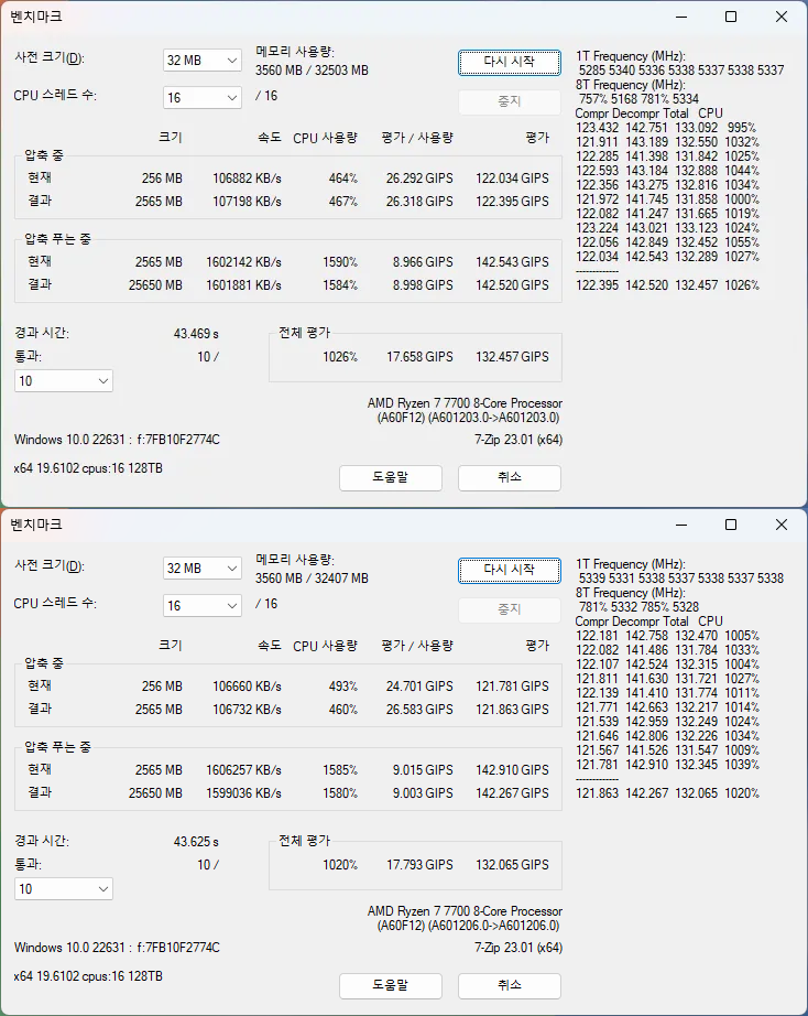 그보다 좀 더 무거운 7-zip 벤치마크에서는 5.45GHz