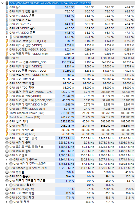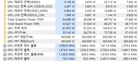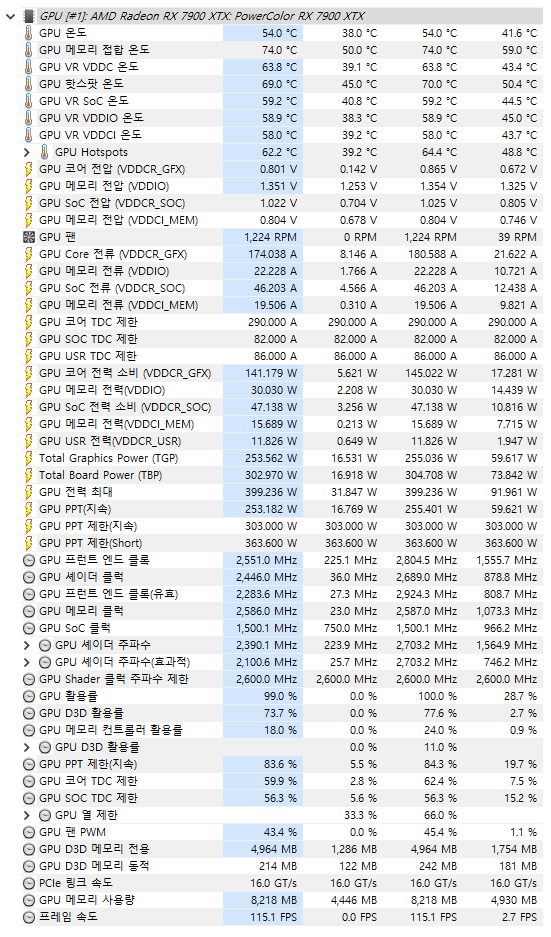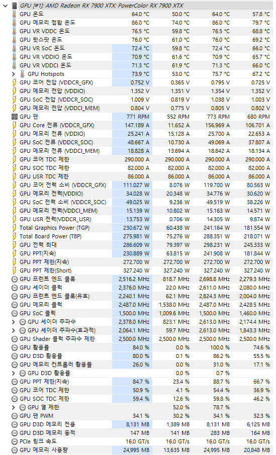 165Hz + 멀티 모니터 환경에서 메모리 클럭이 항시 최대를 찍으며 아이들 전력을 20~30W씩 빨아먹던 6900XT의 고질병이 여기서는 보이지 않는다