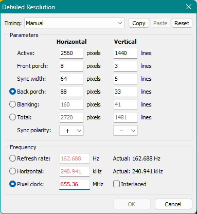 CRU로 픽셀 클럭을 약간 낮춰 163Hz로 만들어 해결