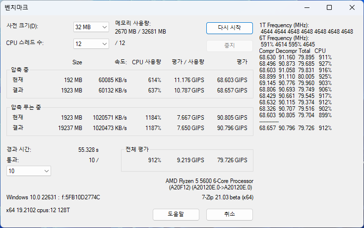 7-zip에서는 대략 평균 4.6GHz 정도의 클럭, 그리고 80W 정도의 전력 소모를 보여준다