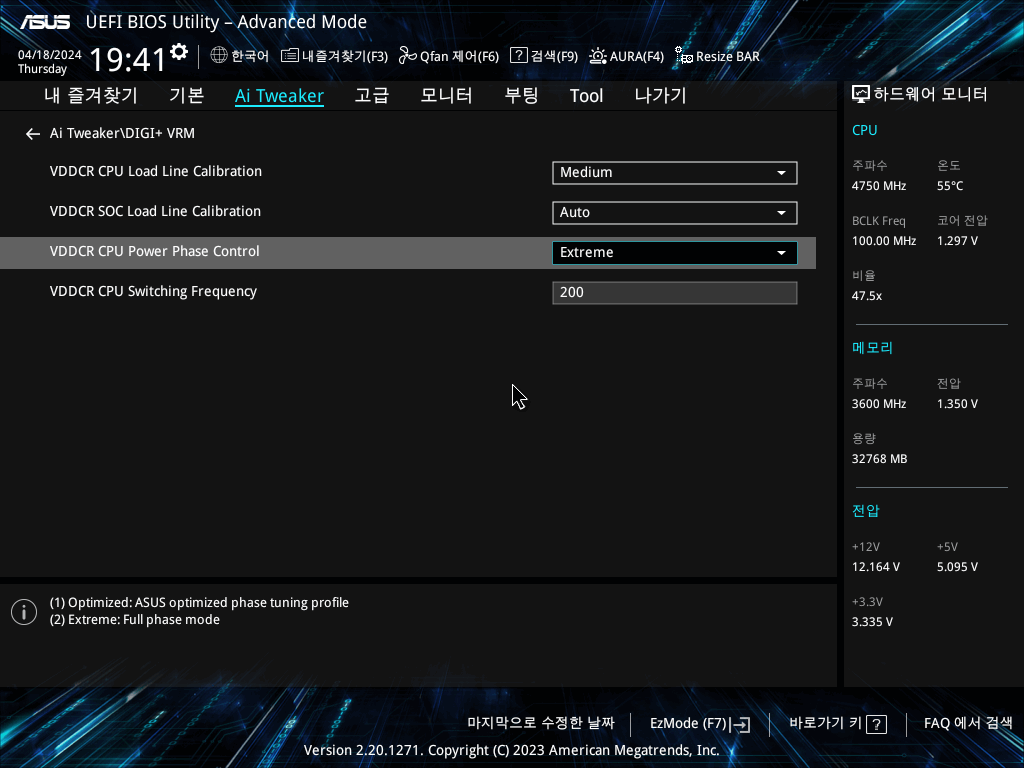 워낙 전원부가 부실한 놈이라 페이즈 컨트롤을 옵티마이즈로 하건 익스트림으로 하건 별 차이는 없는 듯
