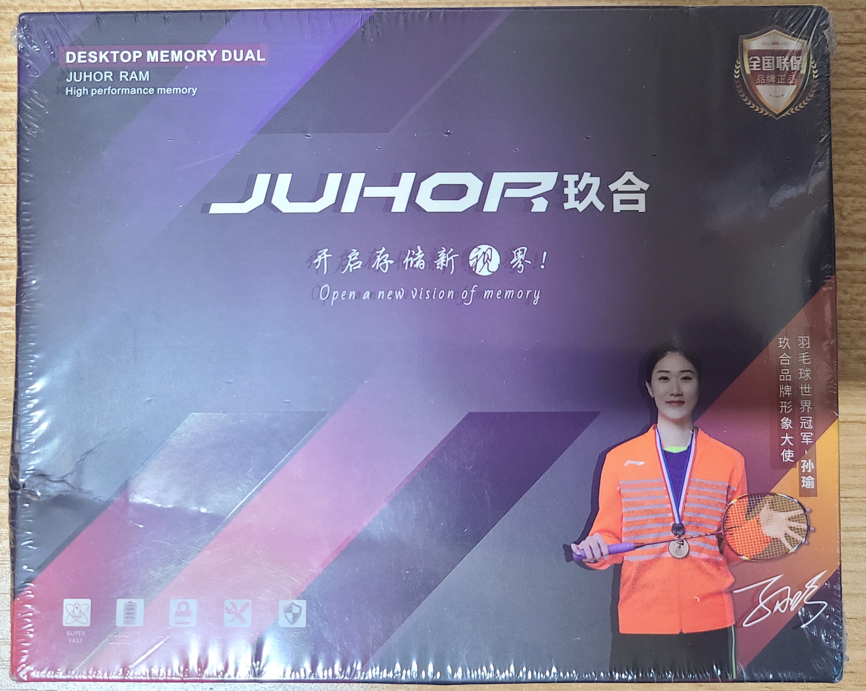 패키지에는 배드민턴 선수 쑨유의 사진과 사인이 있다
