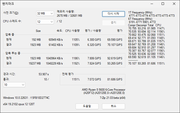 다만 7-zip 벤치마크 외에는 돌아가는게 없다