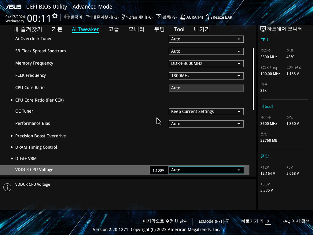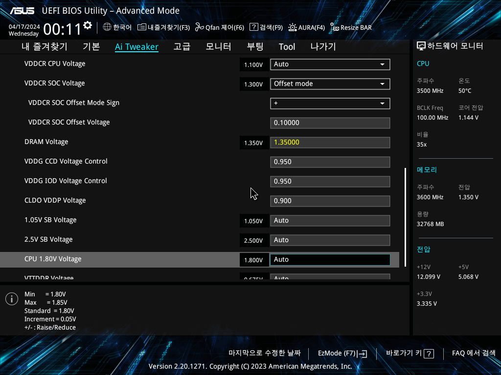 세부 전압들은 과거 바이오스타 B550 쓰던 시절 기억에 기반하여 잡았다