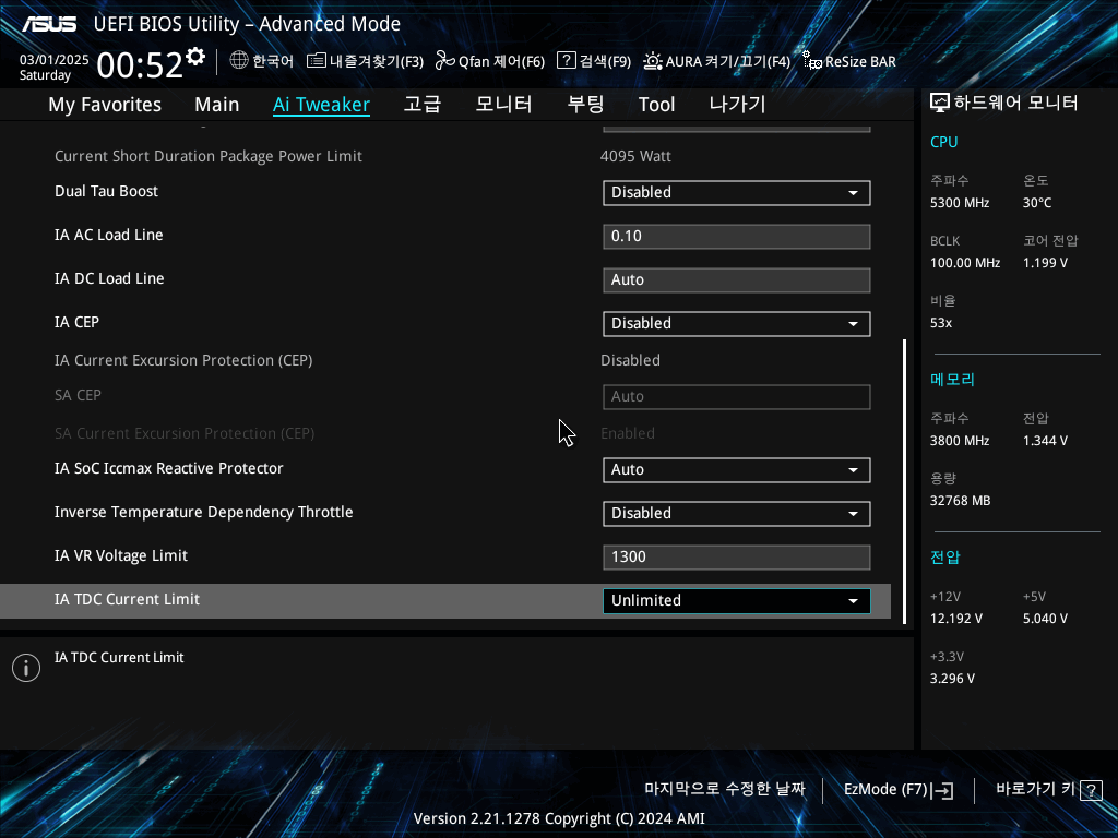 전압은 1.3V로 제한을 걸었고 TDC 제한은 풀어버렸다