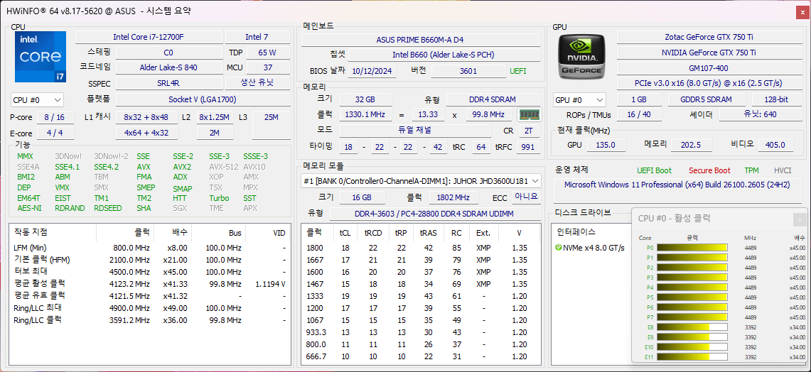 XMP 4000짜리인데 B660따리에서 4000을 그대로 쓰긴 무리가 아닐까 싶어 클럭과 전압을 약간 내렸다