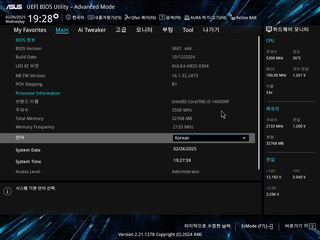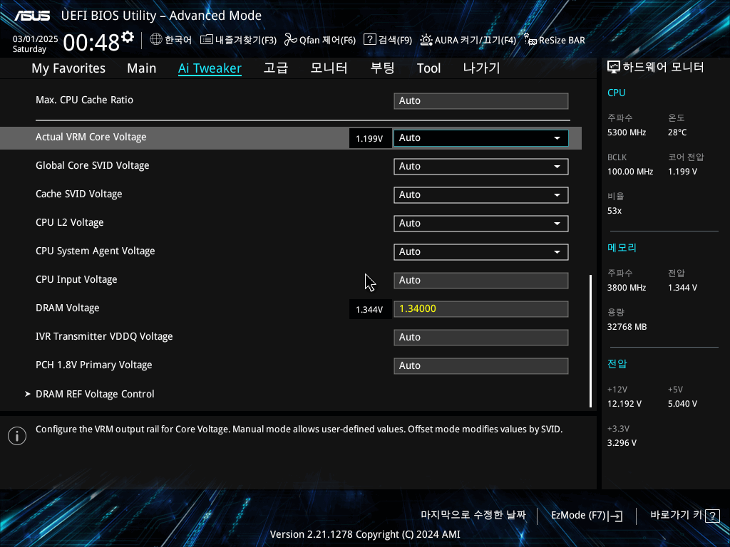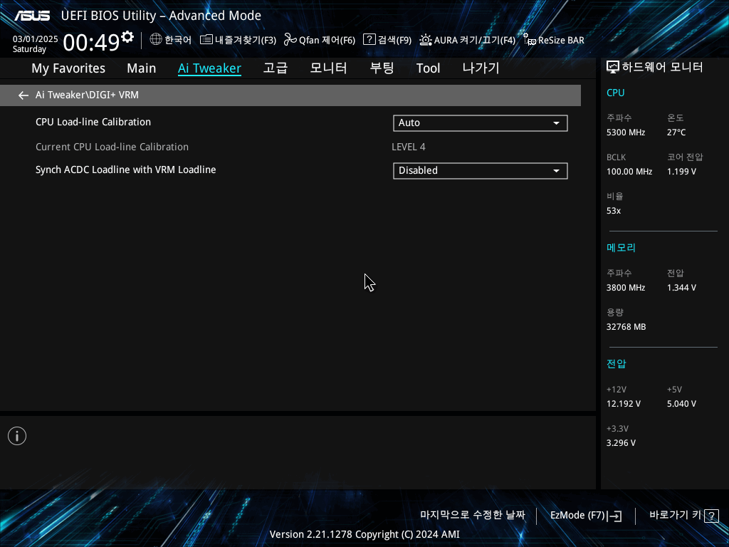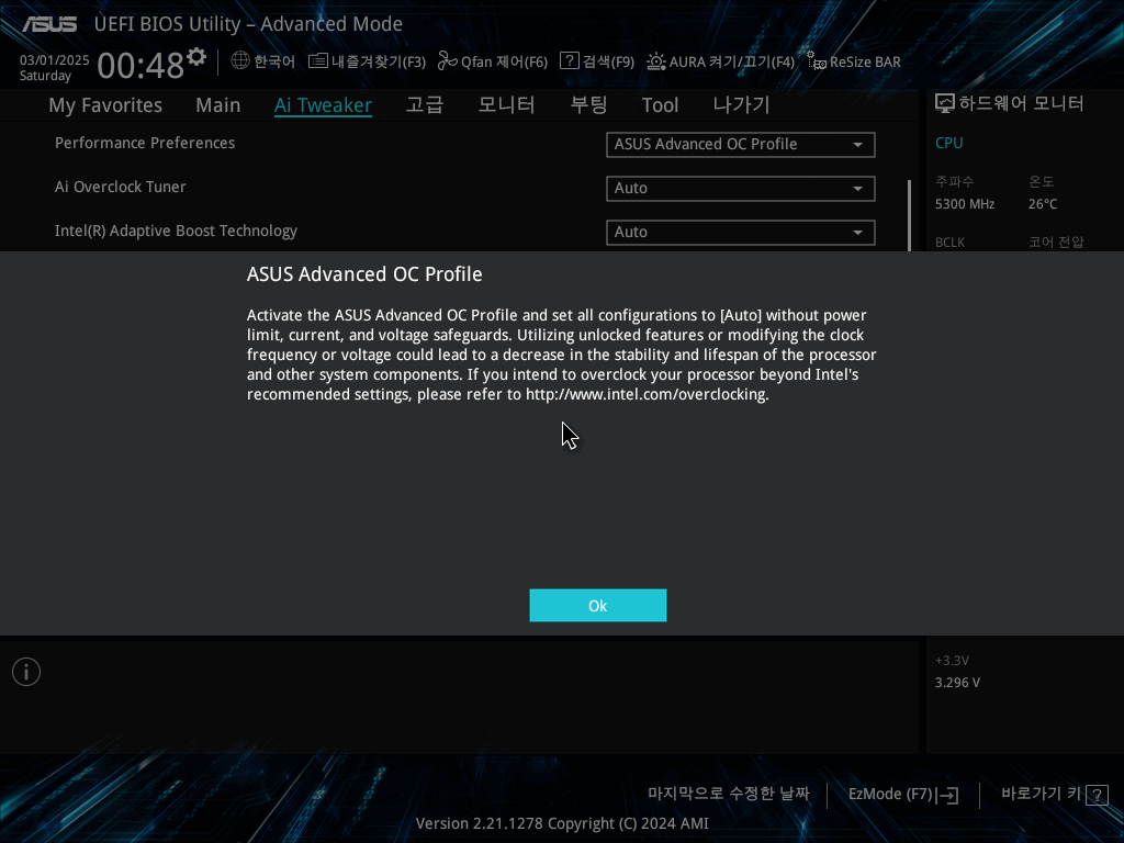 일단 퍼포먼스 선호 설정을 인텔 디펄트가 아닌 아수스 어드밴스드 OC 프로파일로